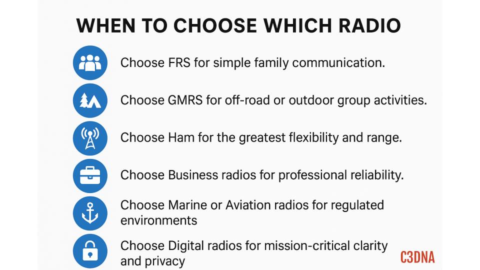 In power outages or disasters, radios remain dependable. Families often choose FRS or GMRS, while trained volunteers prefer ham radios for maximum flexibility.